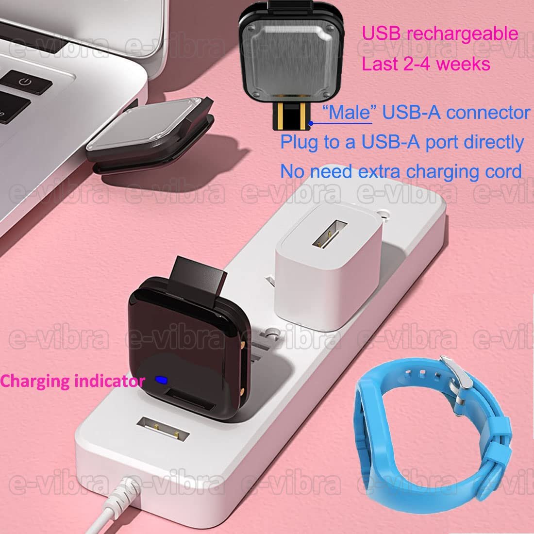 The vibrating watch no need the extra USB cable, just plug the “Male” USB-A connector on the watch to the USB-A port directly, one charge can last up to 35 days with one full charge.